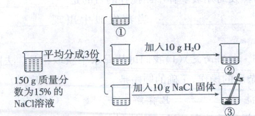 22.C 【解析】溶液的相关计算 20℃时,将150g质量分数为15%的NaCl溶液平均分为3份,每份溶液质量为150g÷3=50g,溶质质量为50g×15%=7.5g,溶剂质量为50g-7.5g=42.5g。溶液具有均一性,150g质量分数为15%的NaCl溶液平均分为3份,每份溶液的溶质质量分数还是15%,故烧杯①中NaCl的质量分数为15%,A错误;烧杯②中溶剂质量为42.5g+10g=52.5g,B错误;20℃时,NaCl的溶解度是36g,则该温度下42.5g水中最多溶解NaCl的质量为$42.5g×\frac{36g}{100g}=15.3g,$烧杯③中NaCl的总质量为7.5g+10g=17.5g>15.3g,故加入的10gNaCl不能完全溶解,形成该温度下NaCl的饱和溶液,故烧杯③中NaCl的质量分数计算式可表示为$\frac{36g}{100g+36g}×100%,$C正确;烧杯②是在50g溶液中加入了10g水,烧杯③是在50g溶液中加入10gNaCl,但由于加入的10gNaCl不能完全溶解,故烧杯②中溶液质量大于烧杯③中溶液质量,D错误。