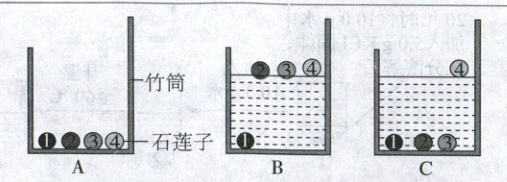 ③莲管秤中的1~4号石莲子的密度依次减小。现将两份卤水分别倒入莲管秤中,观察到石莲子的沉浮情况如图B和图C所示,对应的卤水浓度较大的是______(填“B”或“C”),莲管秤能区分不同浓度卤水的原理是______。