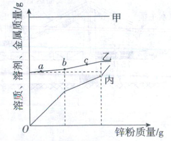25.AB 【解析】金属的化学性质+常见化学反应中物质的质量关系 题中涉及的四种金属中活动性顺序为Mg>Zn>Fe>Cu,锌能与硫酸亚铁和硫酸铜溶液反应,不与硫酸镁反应,且锌先与硫酸铜溶液反应,后与硫酸亚铁溶液反应;在该反应中,溶剂质量不变,固体质量从0开始逐渐增加,溶质质量逐渐增加,所以甲表示溶剂质量,乙表示溶质质量,丙表示烧杯中金属质量,A项正确;锌先与硫酸铜反应,则ab段锌与硫酸铜反应,B项正确;在该反应中,溶剂质量不变,根据图示可知a点对应溶质质量小于c点对应溶质质量,所以a点对应溶液质量小于c点对应溶液质量,即溶液质量a<c,C项错误;c点锌与硫酸亚铁反应,且硫酸亚铁未耗尽,溶液呈浅绿色,D项错误。