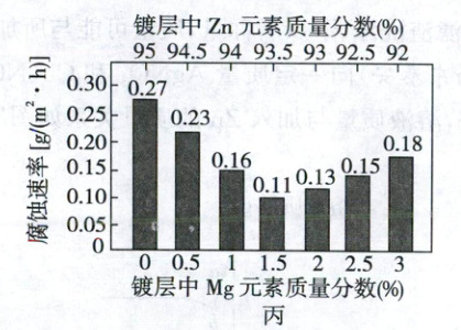 ①在ZnAl镀层中加入适量Mg可调节镀层的耐腐蚀性能。取含Al质量分数为5%的ZnAlMg镀层测试镀层腐蚀速率的结果如图丙,镀层的腐蚀速率随镀层中不同Zn、Mg质量分数变化的规律是____。