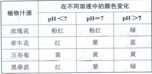 5.C[解析]酸碱指示剂 万寿菊汁液在酸性(pH<7)、中性(pH = 7)和碱性(pH>7)的环境下均为黄色,颜色无任何变化,无法指示溶液的酸碱性,不适合作为酸碱指示剂,故选C。
