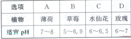 6.B[解析]土壤浸出液的酸碱性与pH 由题干信息可知,牵牛花汁液在酸性溶液中变红,在碱性溶液中变蓝,在中性溶液中为紫色,该校园土壤浸出液能使牵牛花汁液变红,说明该土壤浸出液显酸性。薄荷生长最适宜的pH范围为7.0~8.0,属于中性到碱性范围,因此该土壤不适宜种植薄荷,故选B。