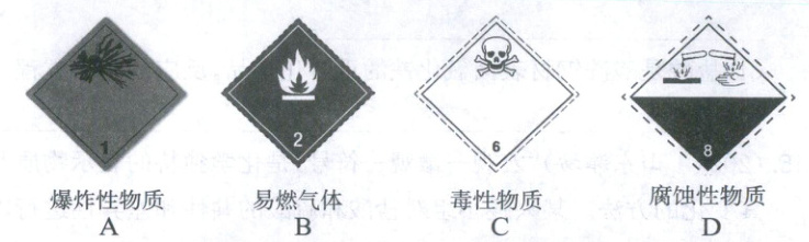 9.D【解析】初中化学常见图标 浓硫酸是一种腐蚀性液体,应该张贴“腐蚀性物质”标志,D正确。