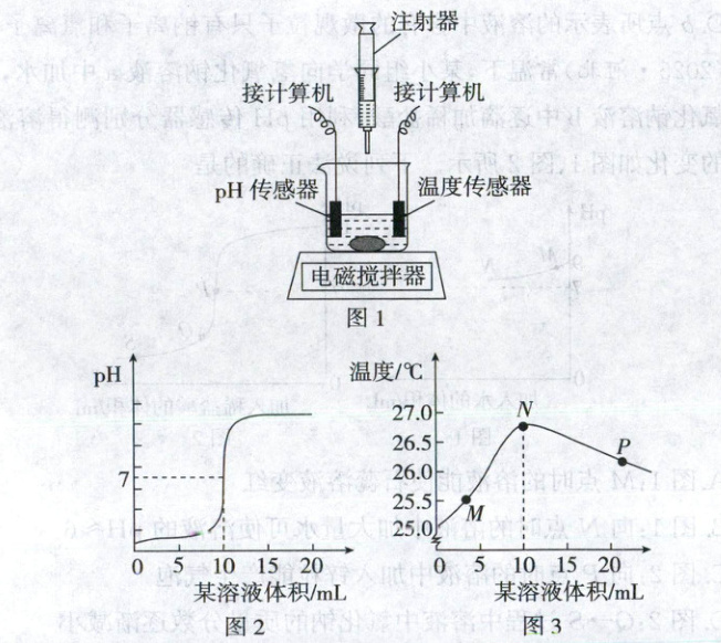 (3)该小组分别向注射器和烧杯中随机加入稀盐酸或氢氧化钠溶液中的一种,用如图1所示的装置进行实验,计算机显示pH传感器和温度传感器所得部分数据曲线如图2和图3所示。请回答下列问题: