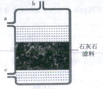 4.D【解析】物质性质+化学反应原理 工业处理含硫酸废水的反应原理为$\mathrm{CaCO_3 + H_2SO_4 \xlongequal\ CaSO_4 + H_2O + CO_2 \uparrow}$,其中$\mathrm{CaSO_4}$为微溶物。废水从c口进入,处理后废水从a口流出,A正确;石灰石滤料不停翻滚摩擦,可以增大石灰石滤料与废水之间的接触面积,使$\mathrm{CaCO_3}$与$\mathrm{H_2SO_4}$充分反应,B正确;若改变水流方向,会使废水与石灰石滤料反应不充分,导致废水处理效果变差,C正确;反应中有$\mathrm{CO_2}$生成,$\mathrm{CO_2}$能溶于水,且$\mathrm{CO_2}$可与$\mathrm{H_2O}$反应生成$\mathrm{H_2CO_3}$,故处理后的溶液显酸性,D错误。