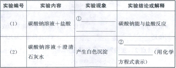 【解析】实验探究 ①碳酸钠溶液和盐酸反应生成氯化钠、水和二氧化碳,可以观察到有气泡产生。②碳酸钠溶液和澄清石灰水中的氢氧化钙反应生成碳酸钙沉淀和氢氧化钠,化学方程式为$\mathrm{Ca(OH)_2 + Na_2CO_3 \xlongequal\ 2NaOH + CaCO_3 \downarrow}$。③滴加无色酚酞溶液上层清液变红,说明溶液中有氢氧根离子,则一定没有$\mathrm{H^+}$;加氯化钡溶液生成白色沉淀,说明溶液中有碳酸根离子,则一定没有$\mathrm{Ca^{2+}}$。