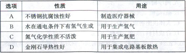 28.C[解析]物质的性质与用途 不锈钢抗腐蚀性好,不易生锈,可以用于制造医疗器械,A正确;水在通电条件下有氢气生成,故可以用水生产氢气,B正确;氮气化学性质不活泼,可以作保护气,氮气由氮元素组成,氮肥中含有氮元素,故氮气可以用于生产氮肥,C错误;金刚石导热性好,故可以用于集成电路基板散热,D正确。