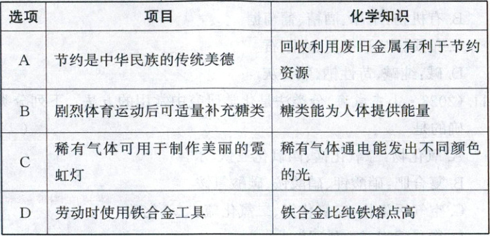 29.D[解析]化学知识 回收利用废旧金属有利于节约资源,A正确;糖类是六类营养物质之一,是主要的供能物质,在运动后补充糖类能为人体提供能量,B正确;稀有气体通电后能发出不同颜色的光,可用于制作霓虹灯,C正确;合金比纯金属熔点低,铁合金比纯铁熔点低,D错误。