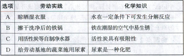 30.A[解析]化学与生活 晾晒湿衣服是水由液态变为气态,体现了分子在不停地运动,属于物理变化,不是分解反应,A符合题意;铁生锈是铁与氧气和水共同作用,擦干洗净后的铁锅,可保持铁锅干燥,从而防止生锈,B不符合题意;用活性炭等自制净水器,利用了活性炭的吸附性,可吸附水中的色素和异味,C不符合题意;给劳动基地的蔬菜施用尿素,是因为尿素中含有植物所需氮元素,尿素是一种常见的化肥,D不符合题意。
