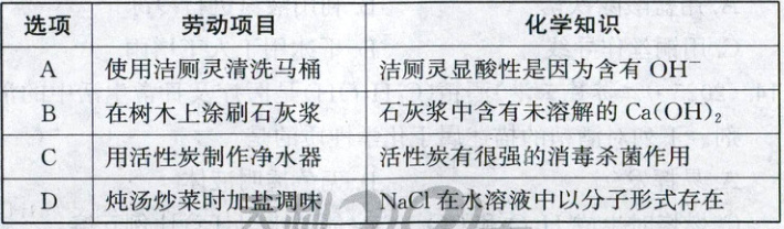 31.B[解析]化学与生活 洁厕灵显酸性,是因为溶液中含有H⁺,A错误;Ca(OH)₂俗称熟石灰或消石灰,微溶于水,Ca(OH)₂和水形成的石灰浆中含有未溶解的Ca(OH)₂,B正确;活性炭有疏松多孔的结构,有很强的吸附性,可以吸附水中的色素、异味,但活性炭不能杀菌消毒,C错误;NaCl在水溶液中以Na⁺、Cl⁻形式存在,D错误。