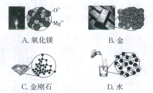2.D 【解析】物质的构成 氧化镁由Mg²⁺、O²⁻构成,A错误;金、金刚石都由原子构成,B、C错误;水由水分子构成,D正确。