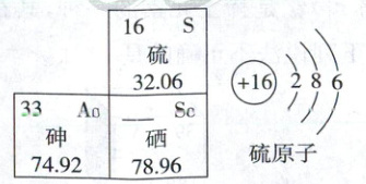 22.D 【解析】元素周期表的应用+原子结构示意图 根据硒在元素周期表中的位置可知,硒的原子序数应为34,在原子中,原子序数=质子数,即硒原子的质子数为34,A正确;硫原子最外层电子数是6,在化学反应中易得到2个电子而形成带2个单位负电荷的阴离子,其离子符号为S²⁻,B正确;砷带“石”字旁,属于非金属元素,C正确;元素是具有相同质子数(即核电荷数)的一类原子的总称,不同种元素的本质区别是质子数(即核电荷数)不同,D错误。