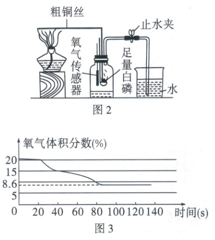 (10) 为精准测得实验过程中氧气含量的变化,小组同学利用如图 2 所示装置(气密性良好)和试剂来探究,集气瓶中空气的体积为 200 mL,氧气传感器测得集气瓶内氧气的体积分数变化曲线如图 3 所示。