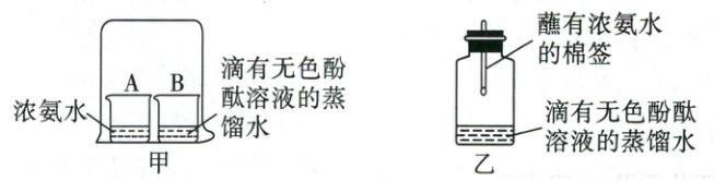 (1)A烧杯中浓氨水易挥发,挥发出来的氨气与B烧杯溶液中的水形成氨水,氨水能使无色酚酞溶液变红,则观察到的实验现象是B烧杯中的溶液由无色变为红色,小组同学认为题图乙实验较好,原因是节约试剂,更环保,装置简便等。