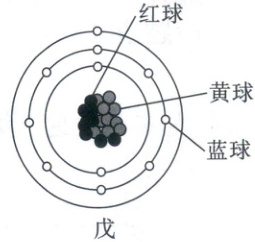 色小球相互粘在一起,组成原子核,放在卡纸中心,并以此为共同的圆心,用绳子绕 3 个直径依次增大的圆表示核外电子层,然后在各电子层上粘上剩余小球,作品如图戊。【认识分子,搭建分子模型】