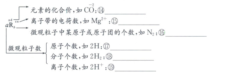 ⑭CO 中氧元素显-2价 ⑮1个镁离子带2个单位的正电荷 ⑯1个氮分子由2个氮原子构成 ⑰2个氢原子 ⑱2个氢分子 ⑲2个氢离子