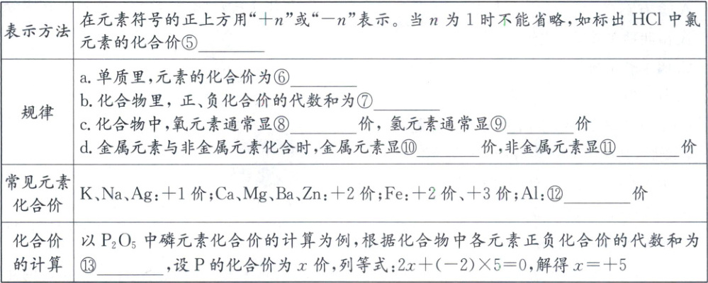 $⑤HCl^{-1} ⑥0 ⑦0 ⑧-2 ⑨+1 ⑩$正$ ⑪$负$ ⑫+3 ⑬0$