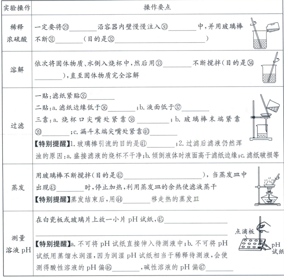 ①1~2 ②铺满试管底部 ③指定的容器内 ④物 ⑤码 ⑥镊子 ⑦玻璃器皿 ⑧手心 ⑨紧挨 ⑩倾斜 ⑪倒放 ⑫胶头滴管 ⑬凹液面的最低处 ⑭大于 ⑮外焰 ⑯灯帽 ⑰\frac{1}{3} ⑱下 ⑲用水润湿 ⑳气泡冒出 ㉑A ㉒形成一段稳定的水柱 ㉓B ㉔长颈漏斗中液面不下降 ㉕B ㉖向外拉注射器的活塞,松开手后,活塞能回到原位 ㉗聚成水滴 ㉘成股流下 ㉙浓硫酸 ㉚水 ㉛搅拌 ㉜使热量迅速扩散,防止酸液飞溅 ㉝玻璃棒 ㉞加速溶解 ㉟漏斗内壁 ㊱漏斗边缘 ㊲滤纸边缘 ㊳玻璃棒 ㊴三层滤纸处 ㊵烧杯内壁 ㊶防止液体冲破滤纸(或防止液体飞溅) ㊷防止局部温度过高,造成液滴飞溅 ㊸较多固体 ㊹坩埚钳 ㊺用干燥洁净的玻璃棒蘸取待测液滴在pH试纸上,把试纸显 答案 示的颜色与标准比色卡比较,读出pH ㊻6大 ㊼小
