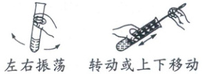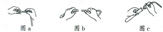 b. 连接橡胶塞和容器(图c):应把橡胶塞慢慢转动着塞进容器口,切不可把容器放在实验台上再使劲塞进塞子,以免压破容器。