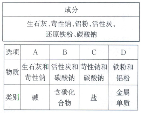 2. (2022·安徽)某自热火锅的发热包成分标识如下图。下列各组物质所属类别正确的是 (