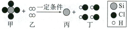 5.D [解析]该反应是氢气(单质)和四氯化硅(化合物)反应生成硅(单质)和氯化氢(化合物),属于置换反应,A正确;从反应微观示意图可知,反应前是四氯化硅分子和氢分子,反应后生成硅原子和氯化氢分子,说明化学反应中分子可以再分,B正确;根据化学方程式$SiCl₄ + 2H₂ \overset{一定条件}{=} Si + 4HCl,$参加反应的甲(SiCl₄)和乙(H₂)两物质分子个数比为1∶2,C正确;根据化学方程式$SiCl₄ + 2H₂ \overset{一定条件}{=} Si + 4HCl,$生成物丙与丁的质量比为28∶[4×(1 + 35.5)] = 28∶146,D错误。