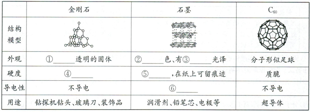 ①无色 ②灰黑 ③金属 ④硬度大 ⑤质软 ⑥导电性好