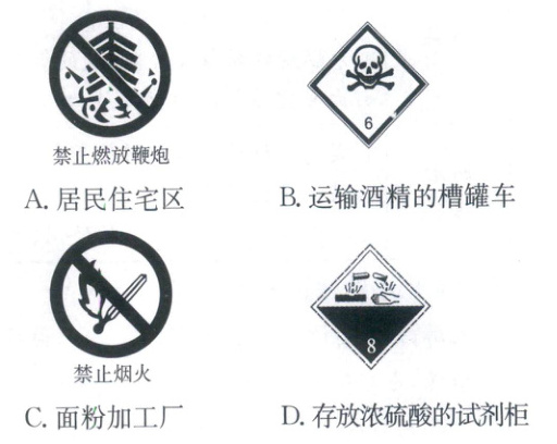 4.B [解析]居民住宅区燃放鞭炮容易造成火灾等事故,应禁止燃放,故选项A正确;酒精属于易燃液体,没有毒性,题图所示标志是有毒品标志,故选项B错误;面粉厂的空气中有大量可燃粉尘,遇明火易发生爆炸,所以要严禁烟火,故选项C正确;浓硫酸具有很强的腐蚀性,题图中所示标志是腐蚀品标志,故选项D正确。