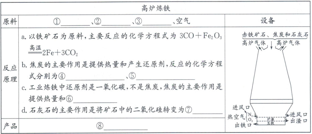 ①铁矿石;②焦炭;③石灰石;④${C + O_2\xlongequal{高温}CO_2}$;⑤${CO_2 + C\xlongequal{高温}2CO}$;⑥产生还原剂一氧化碳;⑦炉渣;⑧生铁