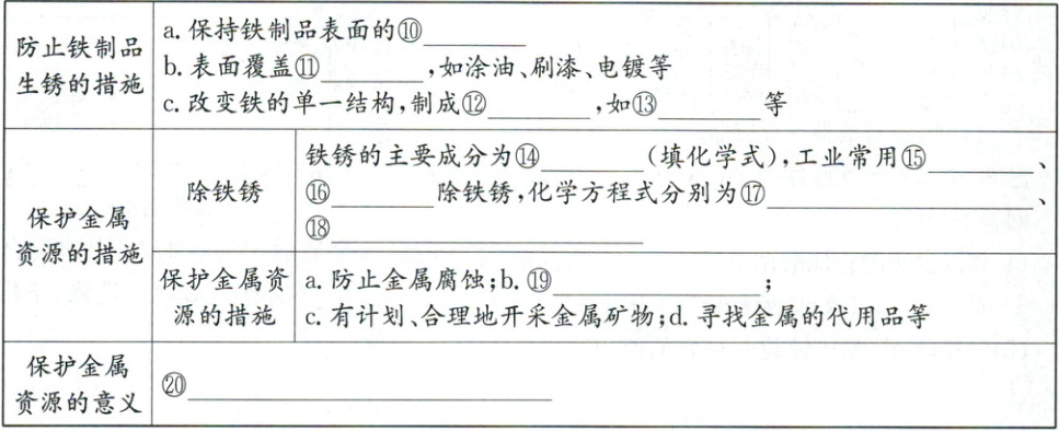 ⑨铁与氧气(或空气)和水同时接触;⑩干燥;⑪保护层;⑫合金;⑬不锈钢;⑭Fe₂O₃;⑮稀盐酸;⑯稀硫酸;⑰Fe₂O₃ + 6HCl = 2FeCl₃ + 3H₂O;⑱Fe₂O₃ + 3H₂SO₄ = Fe₂(SO₄)₃ + 3H₂O;⑲回收利用废旧金属;⑳节约金属资源,减少环境污染
