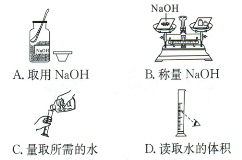 2. C [解析]取用NaOH时,要用药匙,瓶塞应该倒放,防止污染试剂,题图A操作错误;氢氧化钠具有腐蚀性,应放在玻璃器皿中称量,题图B操作错误;倾倒液体时,量筒要倾斜,标签要向着手心,瓶口紧挨量筒口,题图C操作正确;量取水读数时,量筒必须放平,视线与量筒内的液体的凹液面的最低处保持水平,不能仰视或俯视读数,题图中为仰视读数,题图D操作错误。