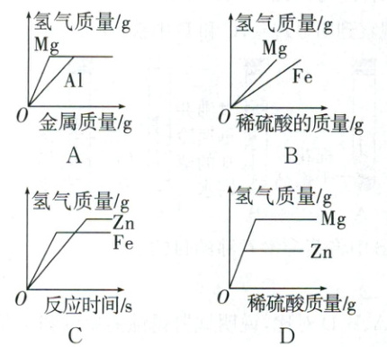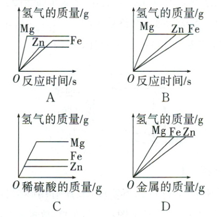 2.D [解析]镁、铝均可与稀盐酸反应生成氢气,足量金属与等量等浓度的稀盐酸反应,参加反应的氯化氢质量相等,生成氢气质量相等,反应中镁、氢气质量比为24:2,铝、氢气质量比为18:2,因此生成等质量氢气,需要金属质量大小关系为镁>铝,A错误;镁、铁均可与稀硫酸反应,反应中镁、硫酸、氢气质量比为24:98:2,铁、硫酸、氢气质量比为56:98:2,等质量镁和铁反应,消耗硫酸质量大小关系为镁>铁,生成氢气质量大小关系为镁>铁,且消耗等质量酸,生成氢气质量相等,B错误;锌比铁活泼,相同时间内锌产生氢气的质量更多,斜率更大,根据化学方程式可知,56份质量的铁产生2份质量的氢气,65份质量的锌产生2份质量的氢气,因此等质量的锌和铁与足量酸反应,铁产生氢气的质量更多,C错误;镁、锌均可与稀硫酸反应生成氢气,反应中镁、氢气质量比为24:2,锌、氢气质量比为65:2,向等质量的镁粉和锌粉中逐渐加入等溶质质量分数的稀硫酸,产生氢气质量逐渐增大,当等质量金属全部反应时,最终生成氢气质量大小关系为镁>锌,D正确。