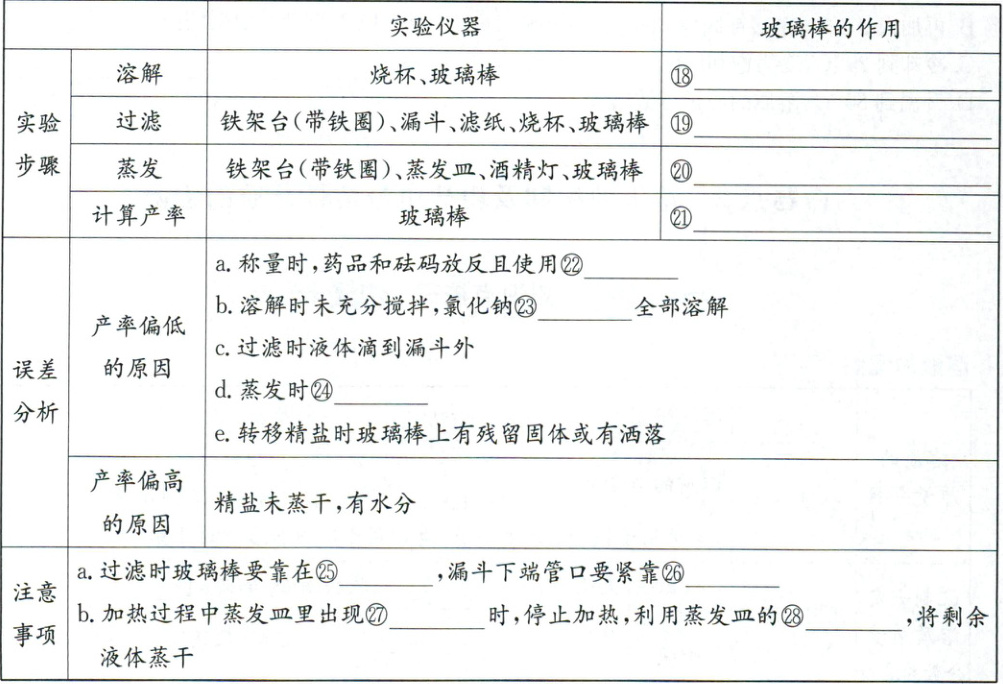 ⑯可溶性;⑰难溶性;⑱搅拌,加速溶解;⑲引流;⑳搅拌,防止因局部温度过高造成液滴飞溅;㉑转移固体;㉒游码;㉓未;㉔液体溅出;㉕三层滤纸处;㉖烧杯内壁;㉗较多固体;㉘余热