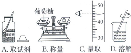 4.C[解析]取试剂时瓶塞应倒放在实验台上,A正确;称量葡萄糖时将其放在天平左盘上,砝码放右盘,左右盘都垫大小、质量相同的称量纸,B正确;读数时视线要与量筒内液体凹液面的最低处保持水平,C错误;溶解时应用玻璃棒搅拌,加速溶解,D正确。