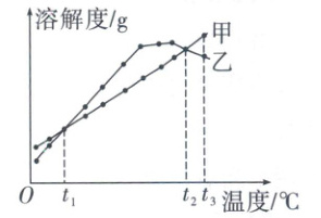 $g$。(3)$t_{2}^{\circ}C$时,将等质量的甲、乙两物质的饱和溶液降温到$t_{1}^{\circ}C$时,析出晶体的质量甲