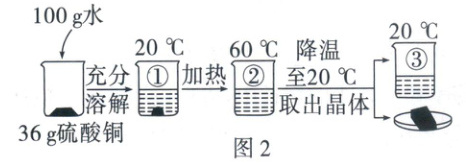 7. (2025·河北)感探究之趣,赏化学之美——制作美丽硫酸铜晶体,图$1$所示为硫酸铜的溶解度曲线,图$2$所示为制作硫酸铜晶体的实验过程(不考虑水的蒸发)。