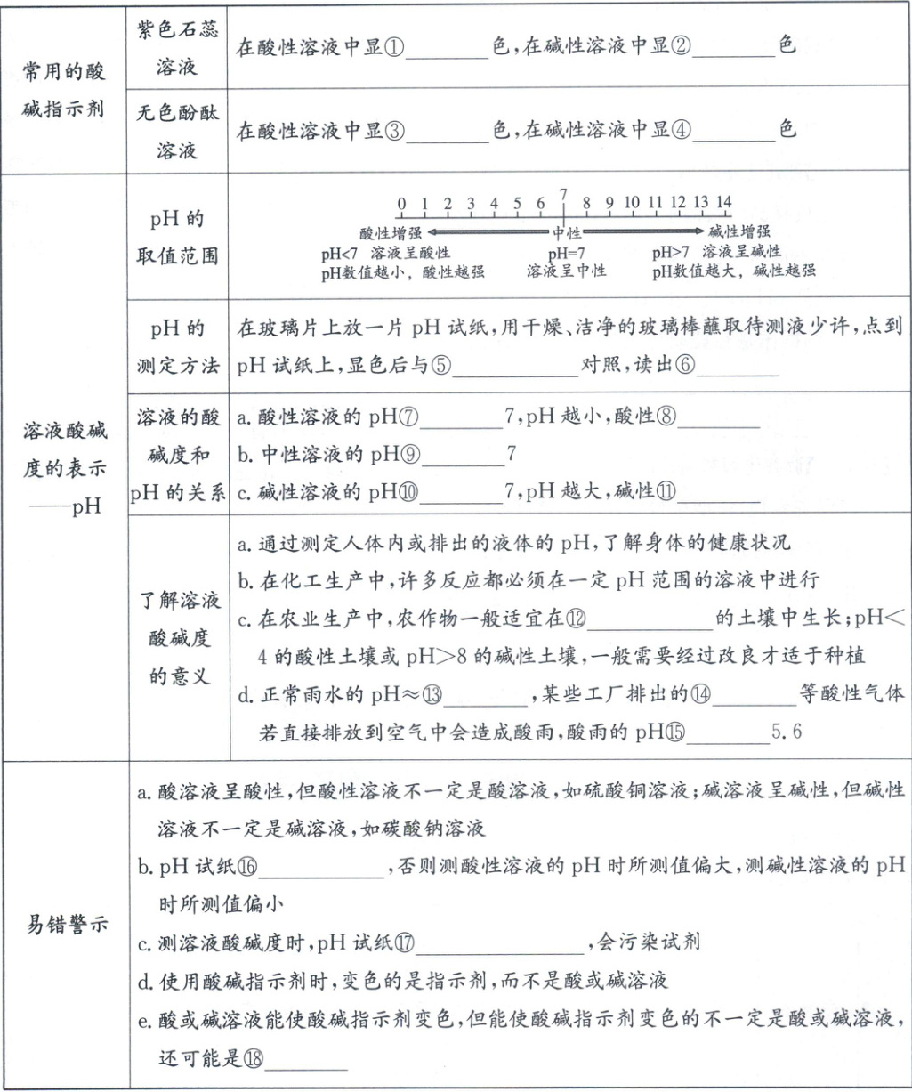 ①红 ②蓝 ③无 ④红 ⑤标准比色卡 ⑥pH值 ⑦< ⑧越强 ⑨= ⑩> ⑪越强 ⑫pH=7或接近7 ⑬5.6 ⑭二氧化硫 ⑮< ⑯不能用水润湿 ⑰不能直接伸入待测液 ⑱盐溶液