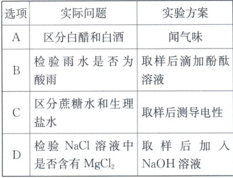 1. (2023·安徽改编)化学知识可以解决生活中许多实际问题。下列实验方案不能解决相应实际问题的是 (
