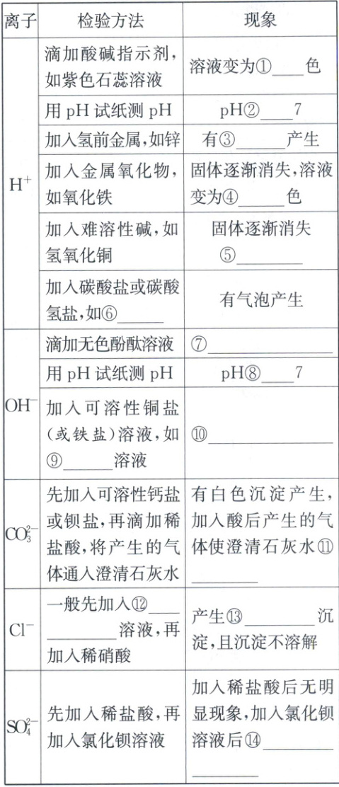 ①红 ②<(或小于) ③气泡 ④黄 ⑤溶液变为蓝色 ⑥碳酸钠(或碳酸氢钠等,合理即可) ⑦溶液变为红色 ⑧>(或大于) ⑨硫酸铜(或硫酸铁等,合理即可) ⑩产生蓝色沉淀(或产生红褐色沉淀,与⑨对应 ⑪变浑浊 ⑫硝酸银 ⑬白色 ⑭产生白色沉淀