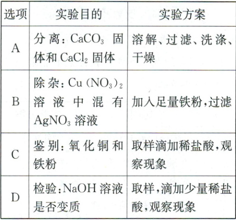 4.C [解析]A.碳酸钙难溶于水,氯化钙易溶于水,可通过溶解、过滤、洗涤、干燥得到碳酸钙固体,然后蒸发结晶才能得到氯化钙固体,题中方案达不到分离的目的,不符合题意;B.加入足量铁粉,铁和硝酸银溶液反应生成硝酸亚铁和银,铁与硝酸铜溶液反应生成硝酸亚铁和铜,不但除去了杂质,也除去了原物质,不符合题意;C.取样滴加稀盐酸,观察现象,氧化铜和稀盐酸反应生成氯化铜和水,黑色固体逐渐溶解,溶液由无色变为蓝色,铁和稀盐酸反应生成氯化亚铁和氢气,产生气泡,且得到浅绿色溶液,现象不同,可以鉴别,符合题意;D.氢氧化钠能与空气中的二氧化碳反应生成碳酸钠和水,从而变质,如果氢氧化钠部分变质,滴加少量稀盐酸,稀盐酸先与氢氧化钠反应生成氯化钠和水,待氢氧化钠完全反应后,碳酸钠和稀盐酸反应生成氯化钠、二氧化碳和水,因为稀盐酸的量太少,即使氢氧化钠溶液部分变质也不会有明显现象,应用足量的稀盐酸,不符合题意。