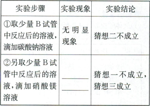 (2)B试管中发生的反应为2NaOH+H₂SO₄=Na₂SO₄+2H₂O,如果恰好完全反应,则溶质为Na₂SO₄;如果H₂SO₄溶液过量,则溶质为Na₂SO₄、H₂SO₄;如果NaOH溶液过量,则溶质为Na₂SO₄、NaOH,故猜想三为Na₂SO₄、NaOH。