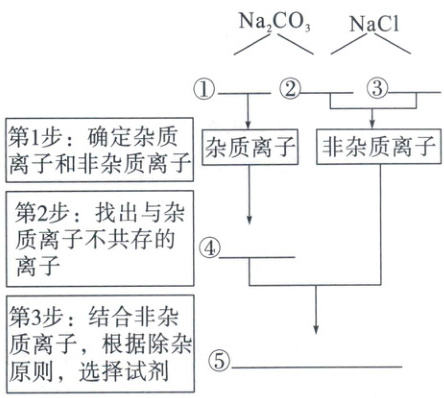 ①$\text{CO}_{3}^{2-}$ ②$\text{Na}^{+}$ ③$\text{Cl}^{-}$ ④$\text{Ca}^{2+}$ ⑤$\text{CaCl}_{2}$ (或④$\text{Ba}^{2+}$ ⑤$\text{BaCl}_{2}$ 或④$\text{H}^{+}$ ⑤$\text{HCl}$)