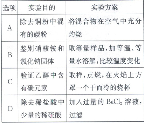 原则,故A错误;硝酸铵溶于水吸热,氯化钠溶于水无明显吸放热现象,取等量样品,加等温、等量水溶解,比较温度变化,温度降低的是硝酸铵固体,温度几乎不变的是氯化钠固体,实验方案能达到目的,故B正确;含碳物质充分燃烧生成二氧化碳,应该用澄清石灰水来检验二氧化碳;取样,点燃,在火焰上方罩一个干而冷的烧杯,烧杯内壁出现水雾,说明生成了水,证明乙醇中一定含有氢元素,无法确定是否含有碳元素,故C错误;稀硫酸能与过量的$BaCl_{2}$ 溶液反应生成硫酸钡沉淀和氯化氢,能除去杂质但引入了新的杂质氯化钡(过量),不符合除杂原则,故D错误。