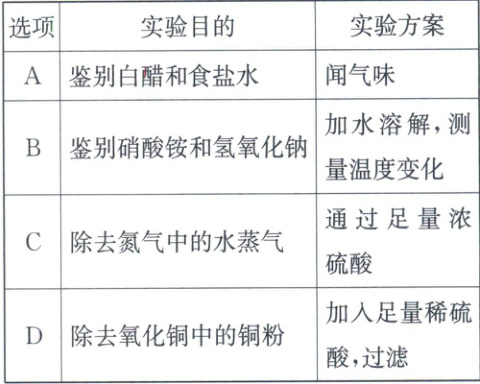2.D [解析]白醋有特殊气味,食盐水无味,可通过闻气味鉴别,A不符合题意;硝酸铵溶于水吸热,温度降低,氢氧化钠溶于水放热,温度升高,通过加水溶解测量温度变化可鉴别,B不符合题意;浓硫酸具有吸水性,通过足量浓硫酸可除去氮气中的水蒸气,C不符合题意;加入足量稀硫酸,氧化铜能与稀硫酸反应,铜粉不与稀硫酸反应,不符合除杂原则,D符合题意。