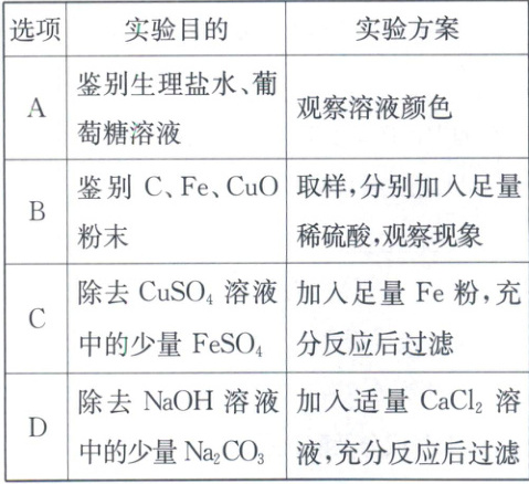 3.B [解析]生理盐水和葡萄糖溶液均为无色透明液体,不能通过观察溶液颜色的方法鉴别,故A不合理;取样,分别加入足量稀$H_{2}SO_{4}$,C与稀$H_{2}SO_{4}$ 不反应,无明显现象;Fe与稀$H_{2}SO_{4}$反应生成$FeSO_{4}$和$H_{2}$,有气泡产生,溶液由无色变为浅绿色;$CuO$与稀$H_{2}SO_{4}$反应生成$CuSO_{4}$和$H_{2}O$,固体逐渐溶解,溶液由无色变为蓝色,现象不同,能鉴别C、Fe、CuO粉末,故B合理;加入足量Fe粉,Fe与$CuSO_{4}$反应生成Cu和$FeSO_{4}$,除去了原物质$CuSO_{4}$,故C不合理;加入适量$CaCl_{2}$溶液,$Na_{2}CO_{3}$与$CaCl_{2}$反应生成$CaCO_{3}$沉淀和NaCl,充分反应后过滤除去$CaCO_{3}$,能除去杂质$Na_{2}CO_{3}$,但会引入新杂质NaCl,故D不合理。