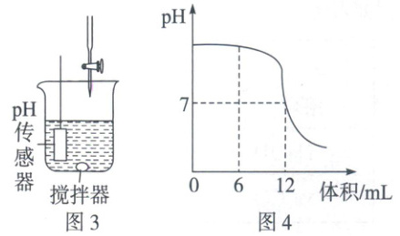。(3) 实验三:图 3 是稀盐酸与氢氧化钠溶液反应的装置,连接 pH 传感器测得该反应过程的数据变化情况如图 4 所示,观察到溶液的 pH 由大于 7 变化至小于 7,说明溶液中