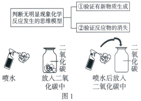(1)实验一中二氧化碳与水反应生成碳酸,利用碳酸能使石蕊溶液染成紫色的干燥纸花变红来证明反应的发生,是依据思维模型①验证有新物质生成。