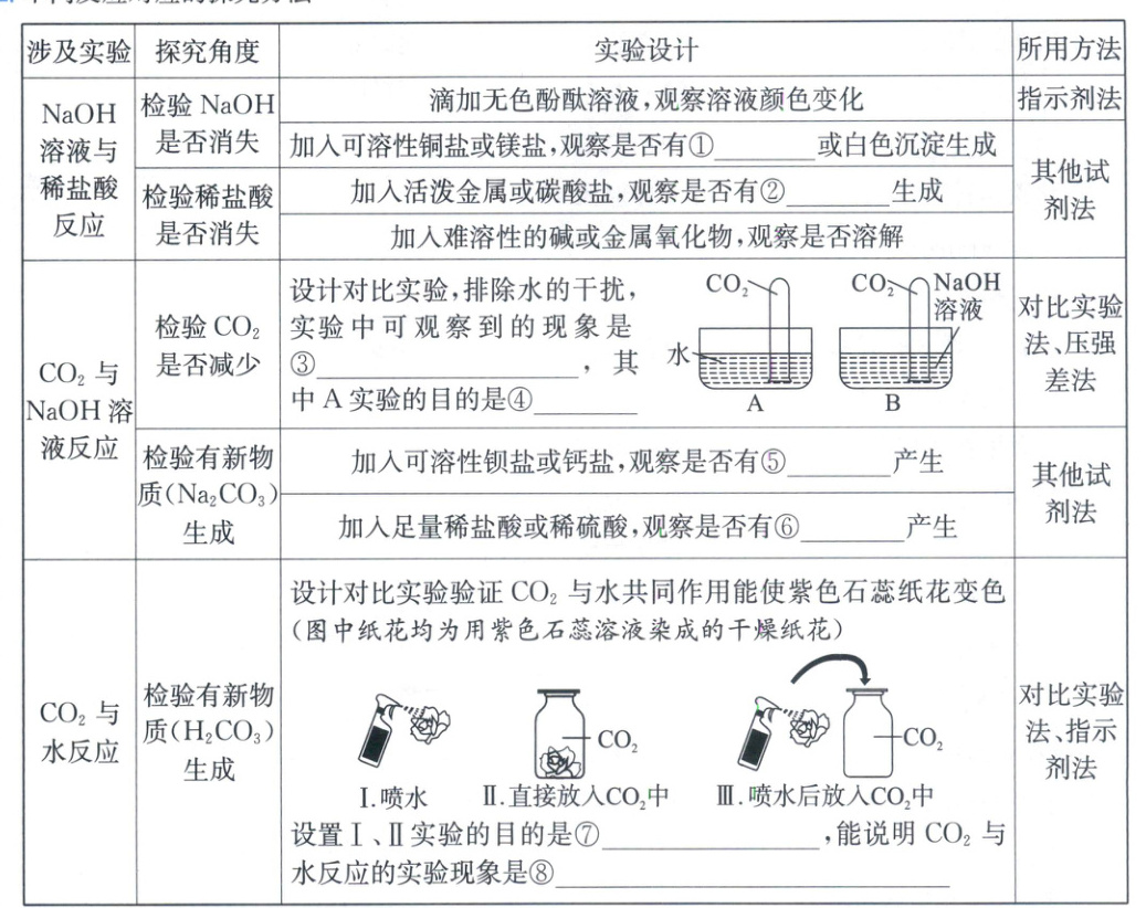 1. 无明显现象的反应:部分酸碱中和反应、二氧化碳和氢氧化钠溶液反应、二氧化碳和水反应。