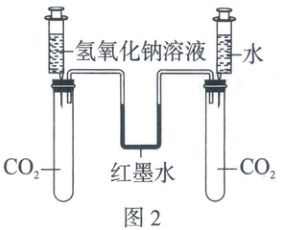 (2)实验二将注射器中相同体积的氢氧化钠溶液和水同时注入试管中,氢氧化钠与二氧化碳反应消耗的二氧化碳体积远远大于水溶解的二氧化碳体积,所以观察到红墨水的液面左高右低,证明二氧化碳与氢氧化钠反应;用水作对照实验是排除二氧化碳溶于水的干扰。