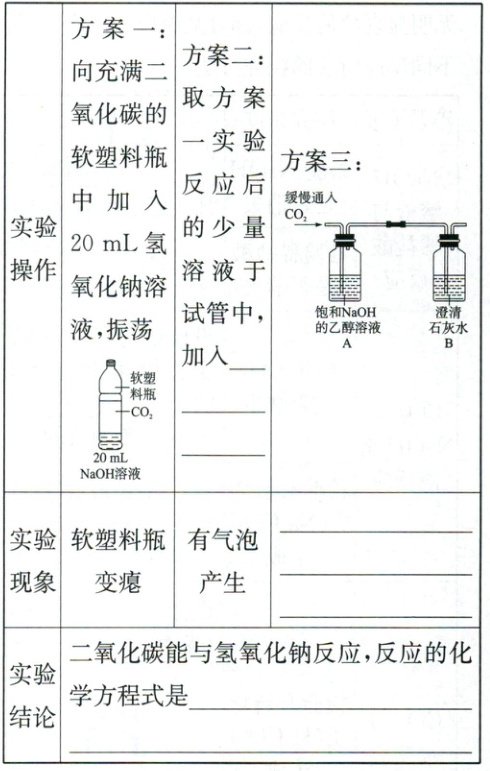 (1)足量稀盐酸或稀硫酸 A中有白色沉淀出现,B中无明显现象 $\mathrm{2NaOH + CO_2 = Na_2CO_3 + H_2O}$