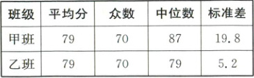 乙班学生成绩的中位数和平均分均为 79 分,标准差小,说明学生成绩之间差别较小,成绩很差的学生少,但成绩优异的学生也很少,建议采取措施提高优秀率.